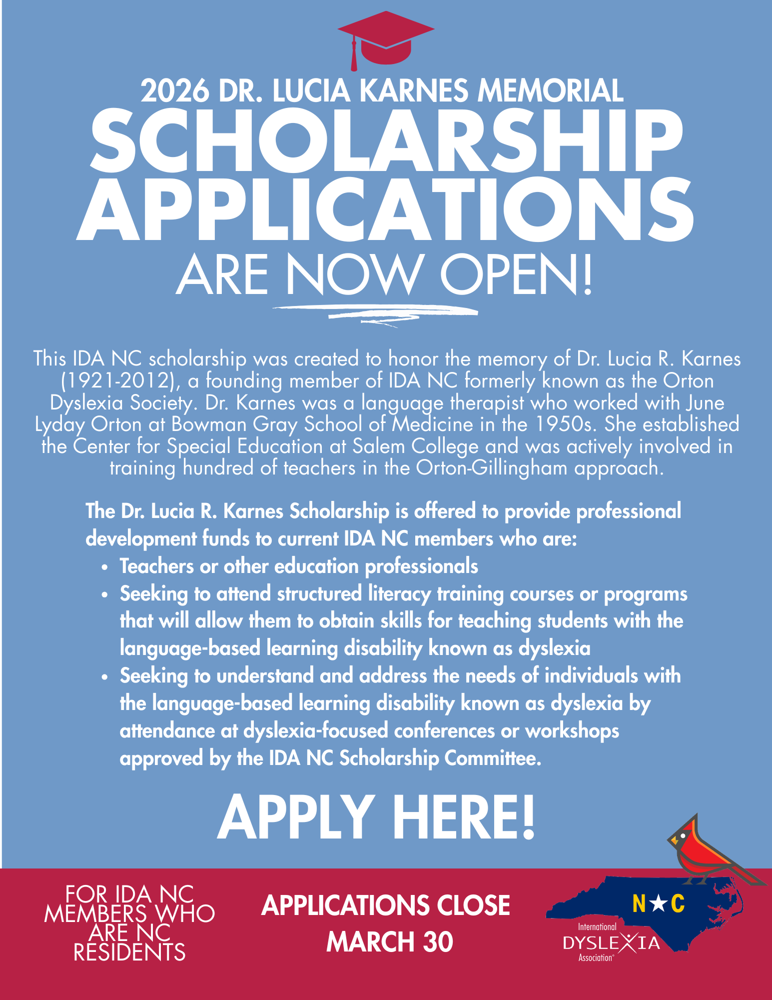 Applications are now OPEN for IDA NC Dr. Lucia Karnes Memorial Scholarship. If you or someone you know is interested in this Scholarship, please share. To be eligible, you must be a current member of IDA-NC and a resident of NC. IDA-NC Board Members are not eligible.